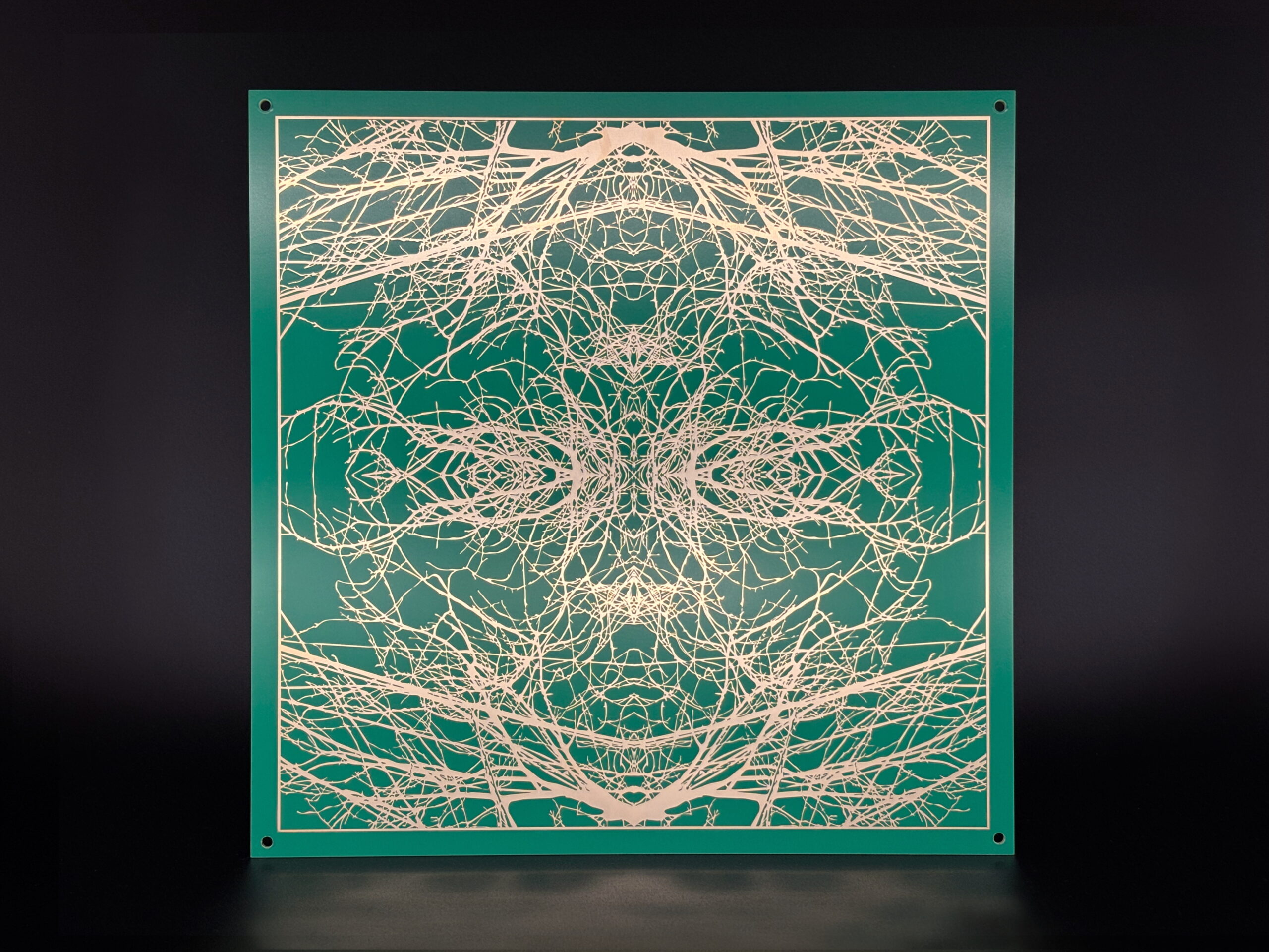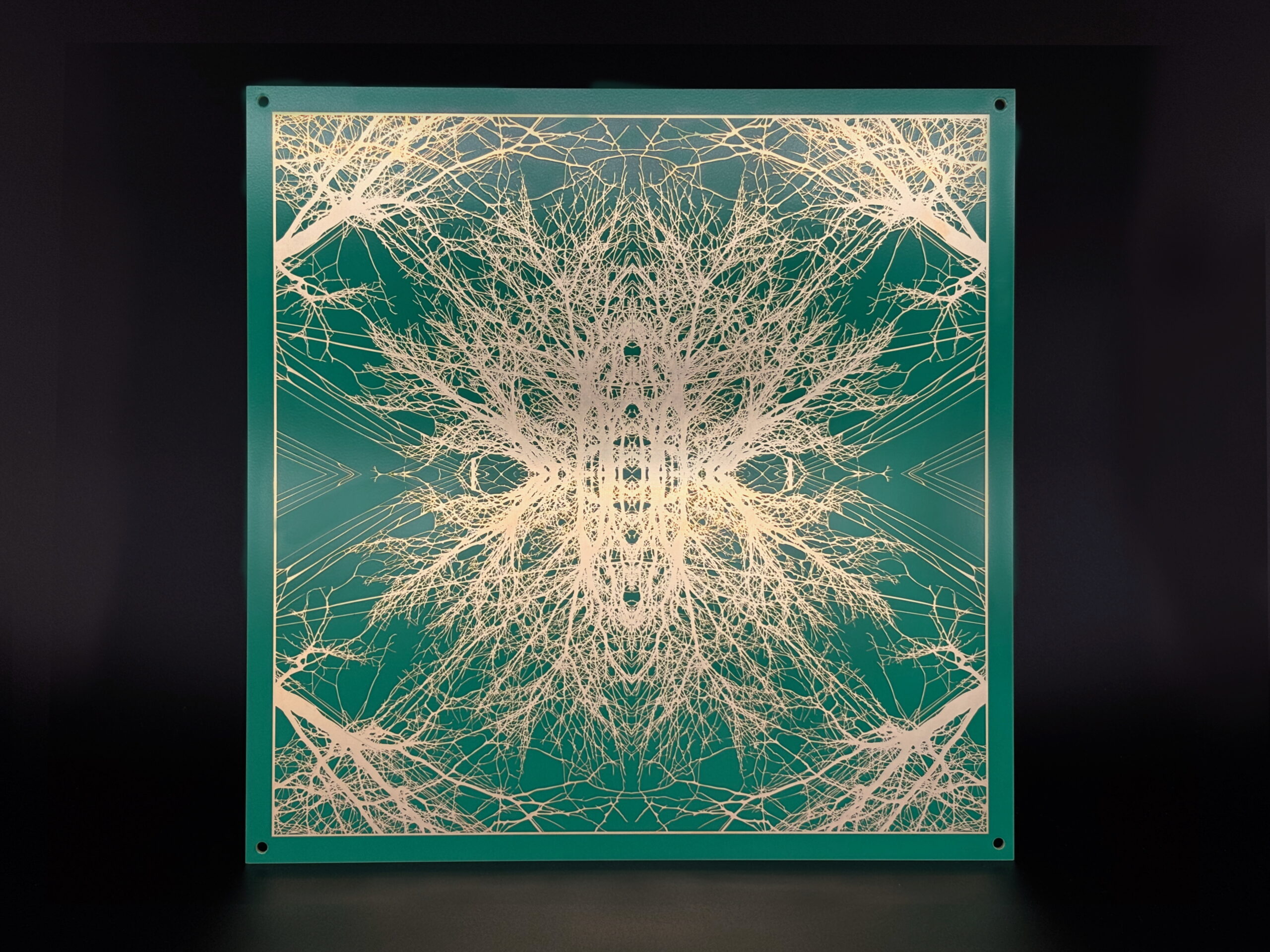 Kristyna and Marek Milde, Mirroring, 2025, From the series Motherboards, commissioned for the solo exhibition Call of the Forest at Kunsthalle, photo etching on printed circuit board (PCB) with 24 carat gold immersion finish, 7 pieces each 30,5cm x 30,5cm x 2,5 mm (12”x 12”x 2,5mm), Edition 1 of 5
