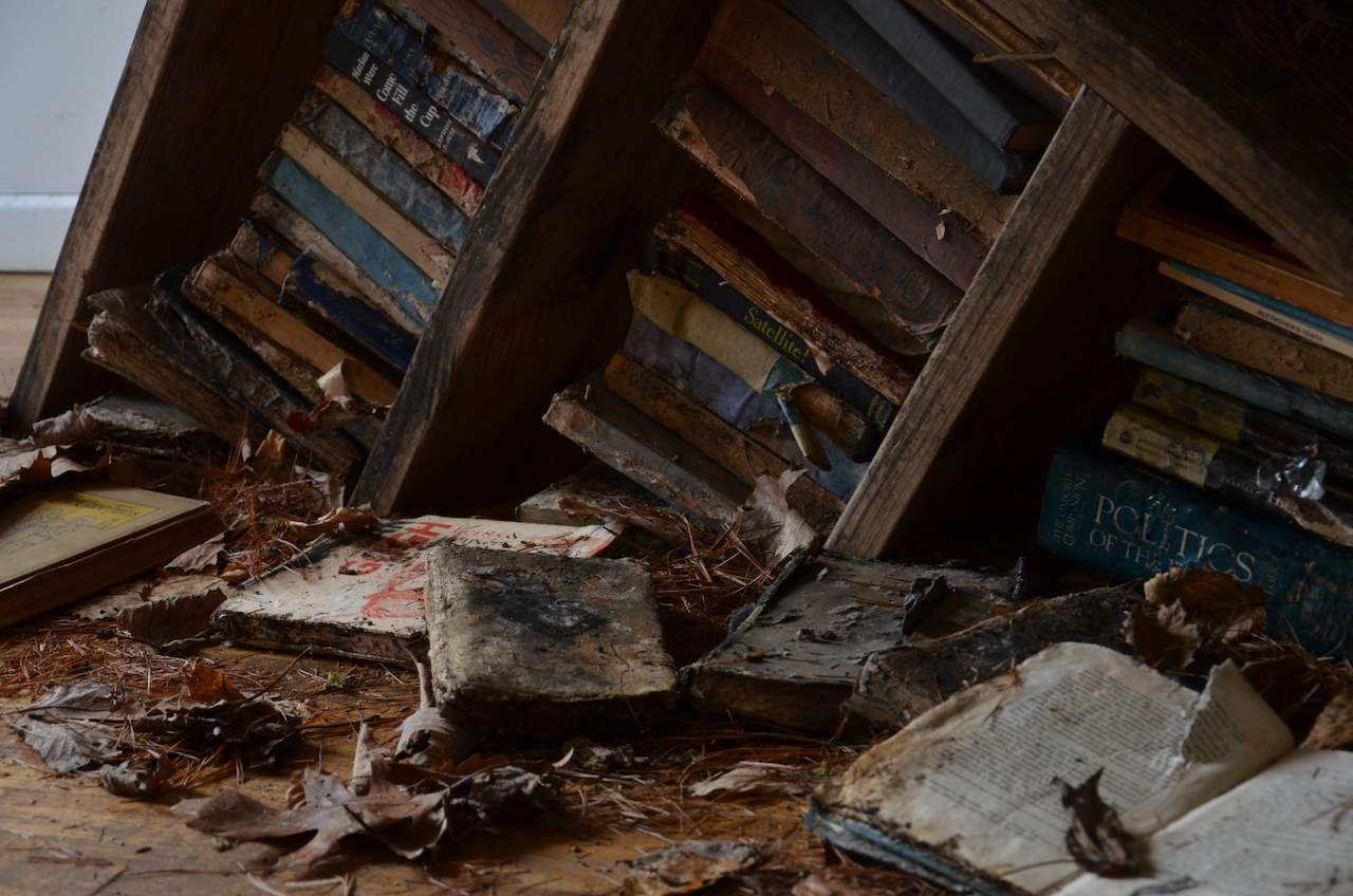 Where Things Go (Rock Hill Library of Overdue Books), In collaboration with Brian Carey and Valerie Tomaselli, 2020, installation view Unison Art Center, New Paltz, decomposed books, W18 1/2†x H18 1/2†x D 6 ½â€