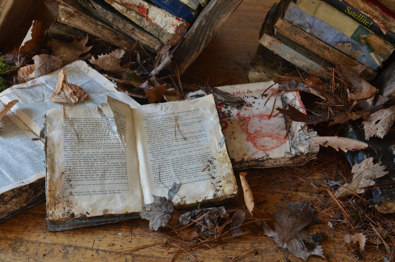 Where the Things Go (Bookworm Library); 2019, decomposed books, wood, organic material